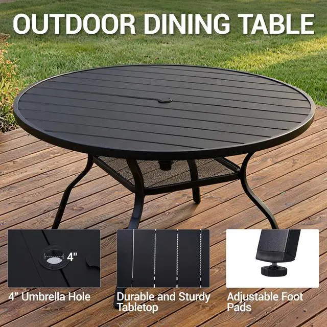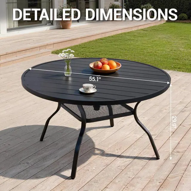 This 55" metal round patio table offers a sturdy and stylish solution for outdoor dining, making it ideal for patios, gardens, porches, balconies, decks, and backyard seating areas. Built with a durable powder-coated steel frame, it provides reliable support for everyday outdoor meals, coffee time, and small gatherings.