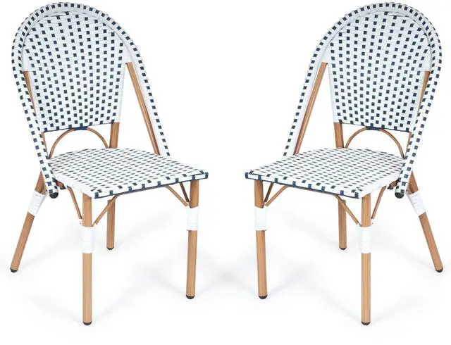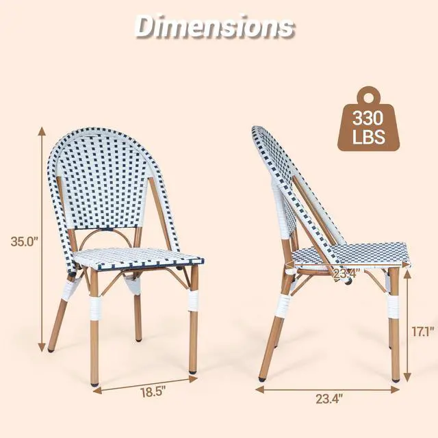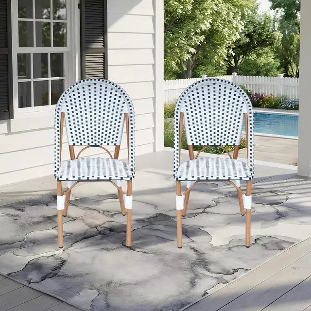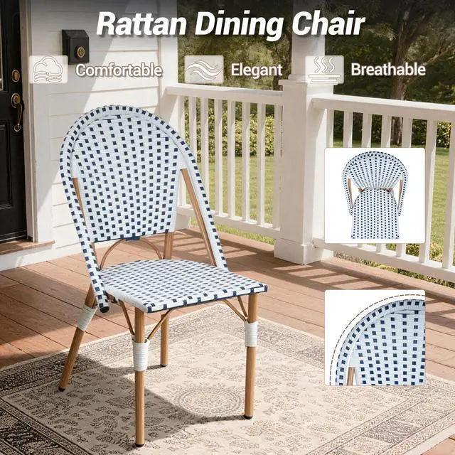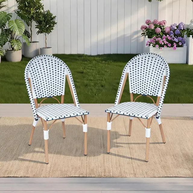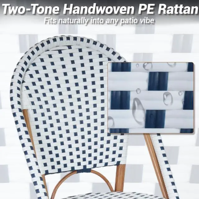Transform your patio, balcony, or kitchen corner into a cozy French style space with our French Bistro Chairs Set of 2. Capturing European outdoor dining charm, these hand-woven rattan chairs blend elegant craftsmanship and durability. Made of premium PE wicker, they are smooth, sun-proof, rain-proof and wear-resistant for indoor and outdoor use. The metal frame with hand-brushed wood-like finish adds warmth and ensures sturdiness. Suitable for garden, porch or dining room, these armless chairs fit any setting. With adjustable foot pads, they adapt to uneven ground and reduce movement noise. Lightweight and stackable, they offer flexible storage without losing comfort and style. Perfect for small outdoor spaces or home bistro setups, they bring function and French elegance.