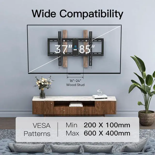 UNIVERSAL DESIGN: This tilt TV wall mount accommodates 37" - 85" TVs weighing up to 132lbs / 60 kg. It features a compatible faceplate that fits VESA 200X100mm (8"x4"), 200X200mm (8"x8"), 300X200mm (12"x8"), 300X300mm (12"x12"), 400X300mm (16"x12"), 400X400mm (16"x16"), and 600 x 400 mm (23.6"x16"). Please check the VESA specifications, TV weight, wall stud location, and any potential blocked cable/input.