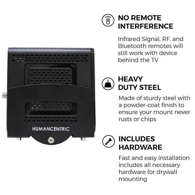 Hide your wires and boxes to enjoy a clean, organized TV setup. Our cable box mount for back of TV is perfect to pair with a mounted TV, just mount the cable box wall mount behind TV.