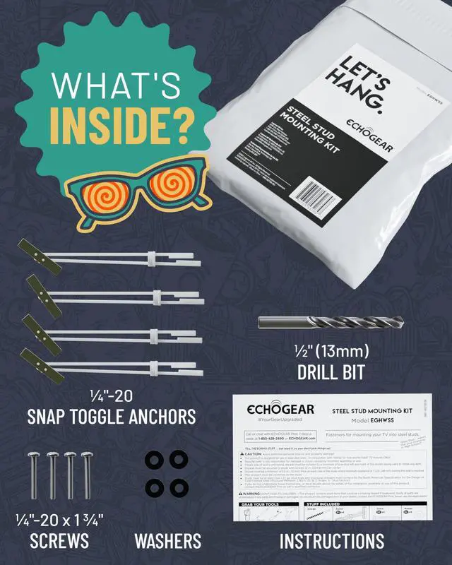 Steel Stud TV Mounting Kit for Fixed & Tilt Mounts Securely Mount TVs up to 175 lbs on Metal Stud Walls Includes UL-Rated Snaptoggle Anchors, Drill Bit, Screws & Washers