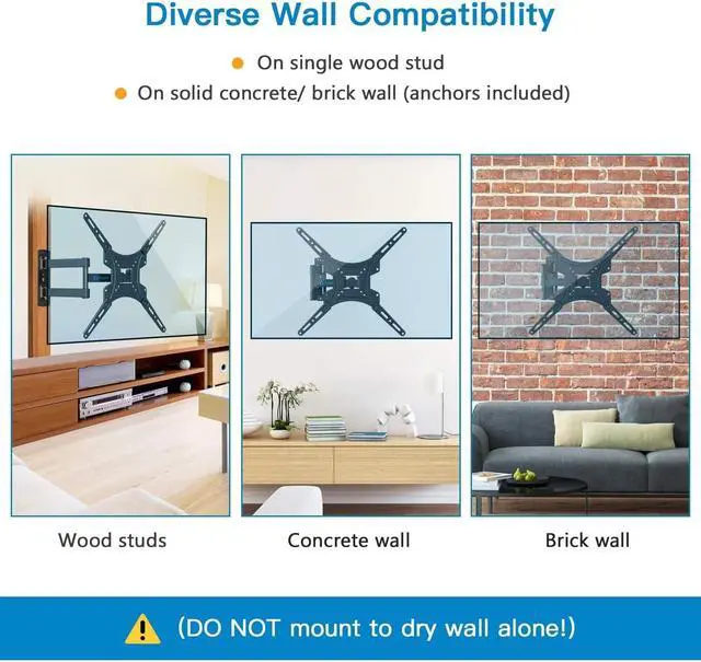 UNIVERSAL TV COMPATIBILITY - This TV wall mount is compatible with most 24"-55" TVs with VESA from 75x75mm to 400x400mm. Max. weight capacity up to 66 lbs. Please check the VESA pattern, weight, and size of your TV before purchasing. Can be mounted to a single wood stud wall and concrete/brick wall.