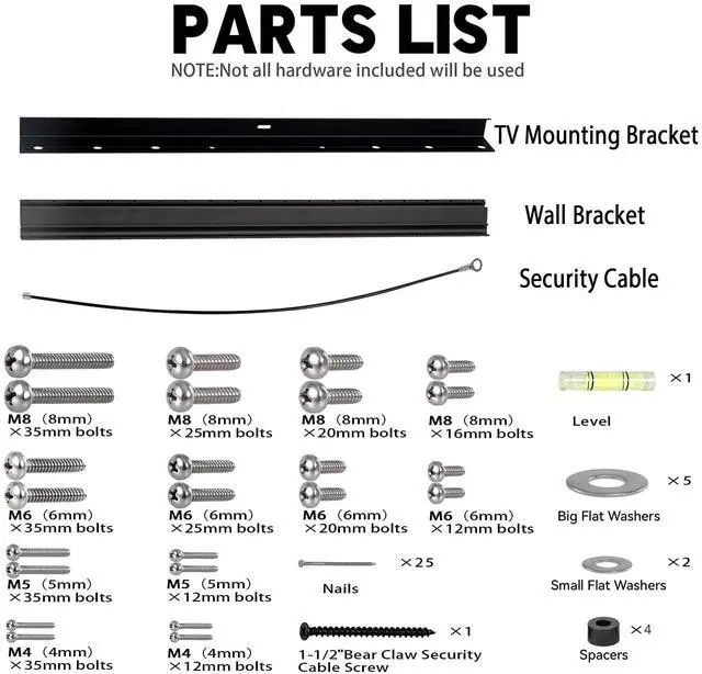 [Package Included] - 1 x TV mounting bracket; 1 x wall bracket; various sizes of bolts; 1 x Bubble Level; nails; a steel cable; security cable screw; and flat washers.