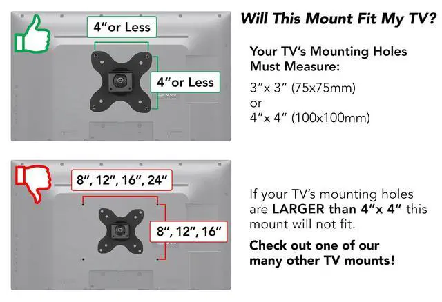 • COMPATIBILITY: TV monitor wall bracket can be used with any television or PC monitor so long as it has the 75mm or 100mm VESA bolt hole pattern. (Measure the distance between bolt holes, in millimeters, if unsure of VESA pattern size).