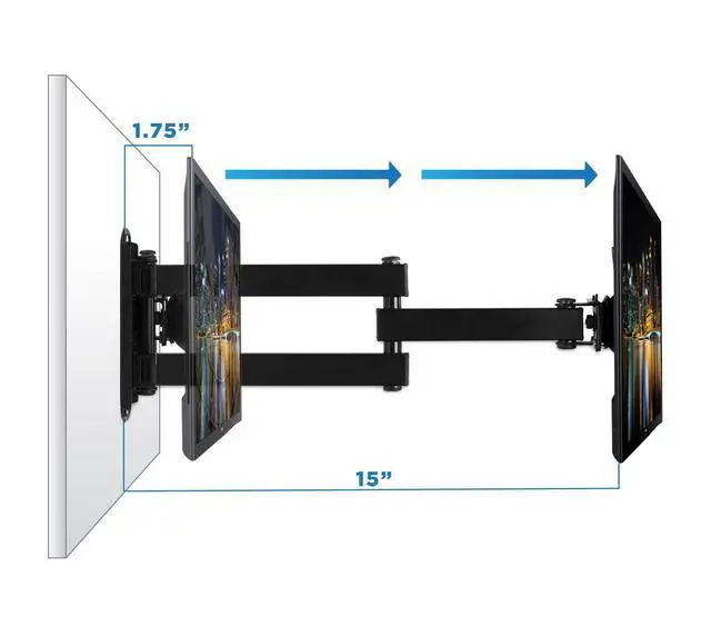 • FEATURES: VESA wall mount arm can fold to bring the screen right up against the wall, or can extend out another 14 inches. The VESA plate head will tilt up or down 15 degrees or rotate 180 degrees to put screen in landscape or portrait orientation, and arm can swivel 180 degrees to left and right. Its sturdy construction holds up to a whopping 40 pounds!