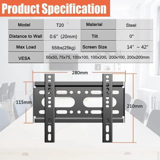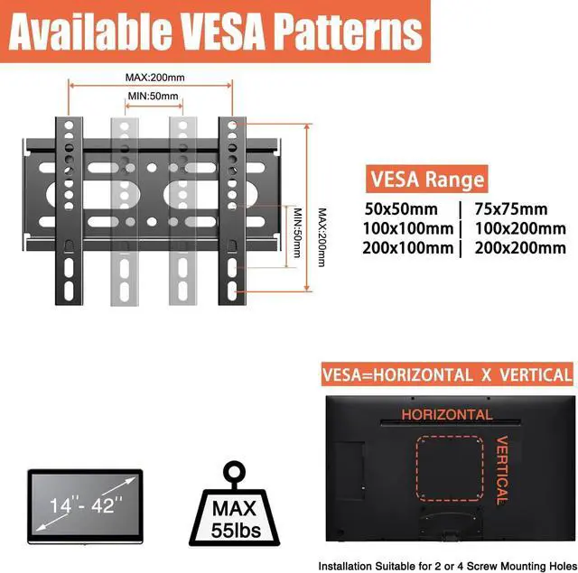 VESA COMPATIBLE - FIXED TV/COMPUTER SCREEN MOUNT: Universal design fits virtually all flat-panel TVs from 14" to 42". VESA max compatibility up to 200X200mm (75×75, 75×100, 100×100, 100×150, 200×100, 200×150, 200×200mm). Please determine your TV's weight and mounting pattern before buying.