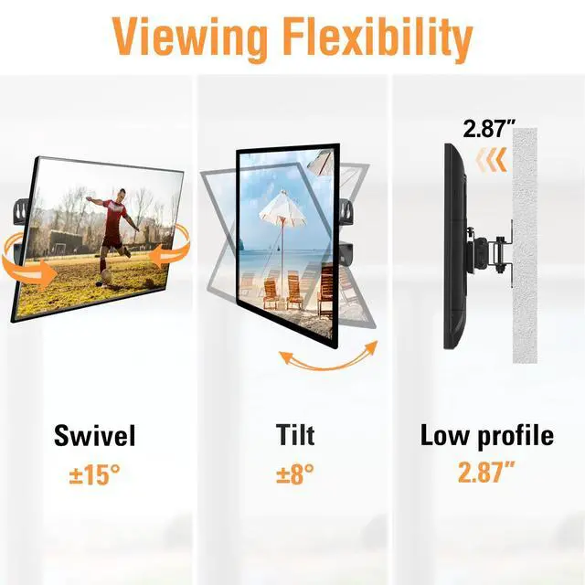 Optimised Viewing Experience - This TV mount gives you maximum flexibility in positioning your TV to fit your environment for a comfortable view. It can swivel left or right 15°, tilt up 8°, and tilt down 8°. The wall mount is low profile, extending just 2.87 inches away from the wall.