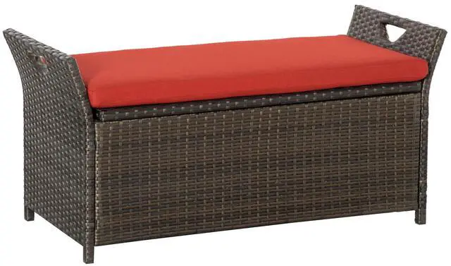 Storage and Patio Furniture: This outdoor storage bench seats two and has a large 27-gallon storage basket. With a thickly padded cushion, it provides soft outdoor seating for your porch or patio. Outdoor Ready Materials: This wicker storage bench is made of hand-woven PE plastic rattan that offers the style of classic wicker with superior durability against water and weather