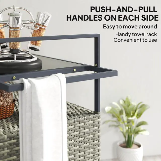 Handles Towel Rack: When that unavoidable spill or cleanup occurs, you'll have everything you need to keep the tempered glass top tidy. Our patio cart has handles used as towel racks, and the outdoor storage cabinet can keep cleaning supplies close by Designed for