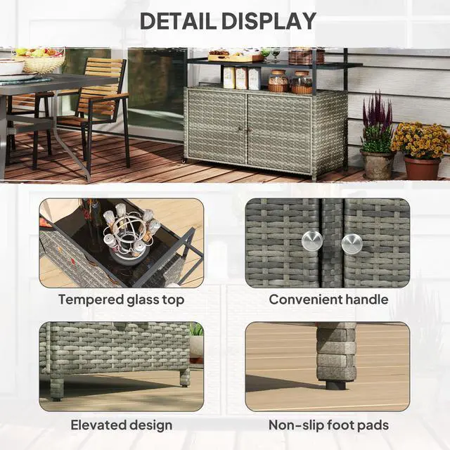 Outdoor Use: This outdoor serving table has the tropical flair of hand-woven PE rattan. PE rattan outdoor storage cart is more weather resistant than typical wicker, and its frame is powder-coated steel for an entirely outdoor-ready build Outdoor Buffet