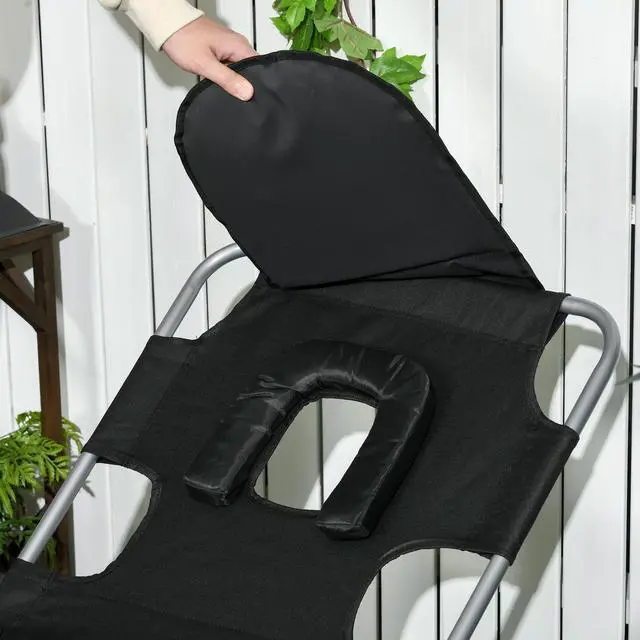 Reclining & Face Hole: Enjoy sitting up, lounging back, and lying down face down. The adjustable backrest of our sun tanning chair allows you to choose from 5 reclining angles with a pillow for padding and holes for your head and arms to let you read as you lie face down. Outdoor Tanning Chair with Storage: Feel free to fully relax, knowing everything is in its proper place. Our outdoor sun tanning chair has a pocket to keep your phone, book, or other items safe and organized. Foldable Design: With the tri-fold design, this patio lounger is space-saving for storage in the garage and easy to travel with, fitting in the trunk of your car. Outdoor Lounge Chair: The outdoor-ready combination of powder-coated steel and tough Oxford fabric allows our beach lounge to endure water while still maintaining a 264 lbs. weight capacity. Outdoor Chaise Lounge Chair Info: Overall Dimensions: 72.8" W x 21.7" D x 11.4" H (Fully Reclined)