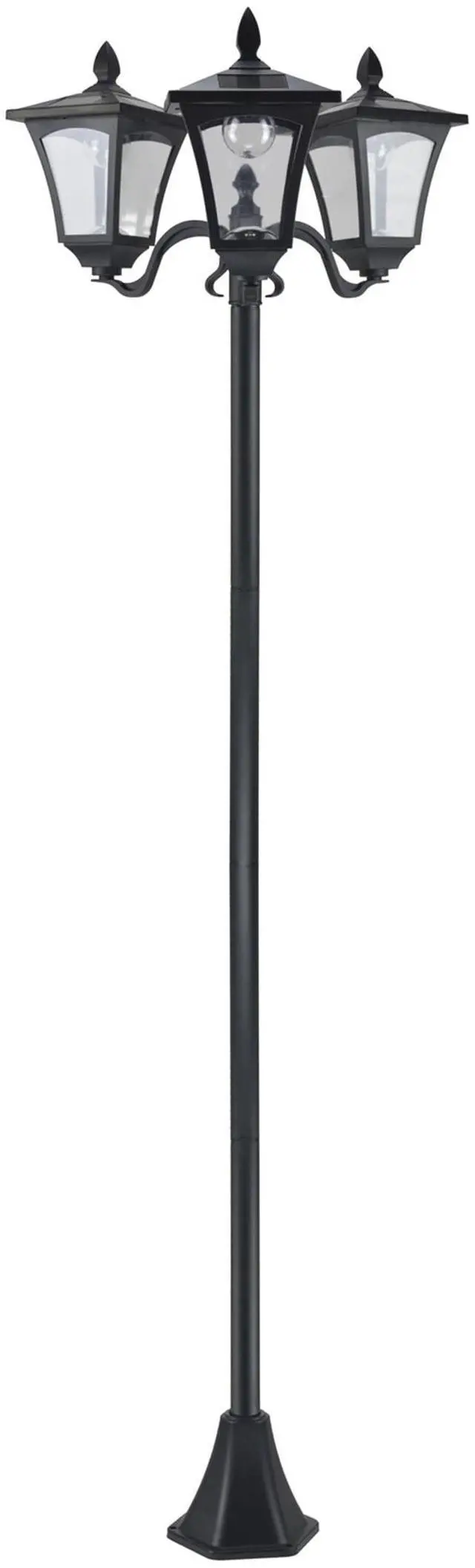 it can be placed anywhere outside and flip the light switch itself. OUTDOOR READY LIGHTS: Created from a stainless-steel frame that's rated IP44 or "splash-resistant" and "secure-to-use" outdoors. There's no need to worry about rain and dust with its resistance to weather and rust. For extra safety against wind and accidents, make sure to use the included screws to secure the lamp's base in place. ENERGY SAVING SOLAR LAMP: Ease the burden of your electric bill on your wallet and the planet. Beyond efficient, this solar-powered lamp post saves you money on your energy bill by supplying its own electricity. LAMP POST INFORMATION: 20.25" L x 18.5" W x 71.75" H. Assembly required.