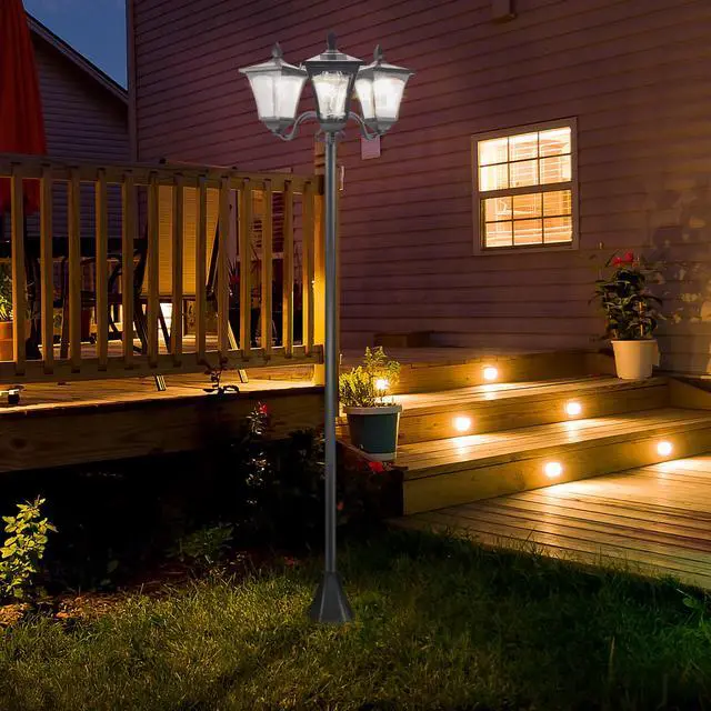 DAY NIGHT LIGHT SENSOR: Come home to a well-lit driveway without worrying about someone flipping the light switch. This three-headed lamp post can turn on automatically when it gets dark (less than three LUX) using the power it stored during the day. Set the lights to bright, dim, or off at your leisure