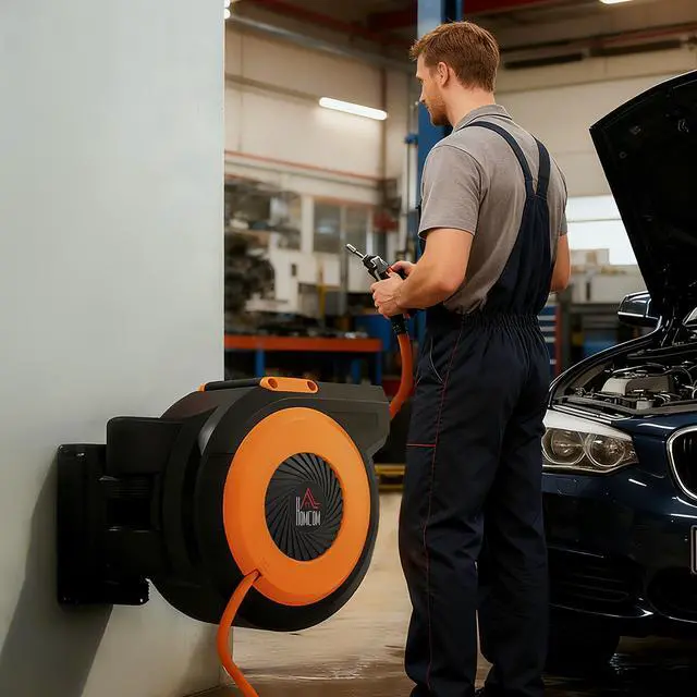 Solid Construction: Made from high-quality plastic, this retractable air hose reel is built to withstand daily use and harsh workshop conditions. UV-resistant materials ensure long-lasting performance indoors or outdoors