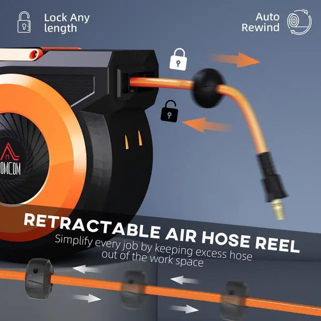 Smooth Automatic Rewind: The air hose reel features an automatic, smooth rewind mechanism that prevents kinks and tangles. Simply pull to the desired length, and the hose locks in place; give it a slight tug to retract neatly back into the reel
