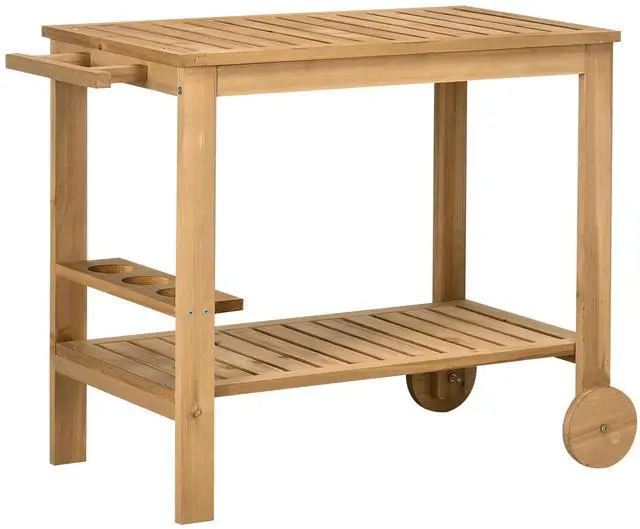 Wooden Cart: Offering a friendly farmhouse charm our outdoor serving cart is crafted out of solid fir wood. The fir wood surface has been protected with a clear coat, helping it withstand water while still allowing the natural woodgrain texture to shine through.