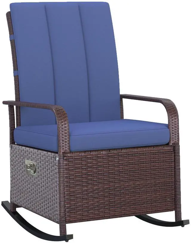 • Wicker Outdoor Rocking Chair, Patio Recliner with Adjustment Backrest, PE Rattan Lounge Chair with Adjustable Footrest and Cushions for Garden, Backyard, Porch, Blue