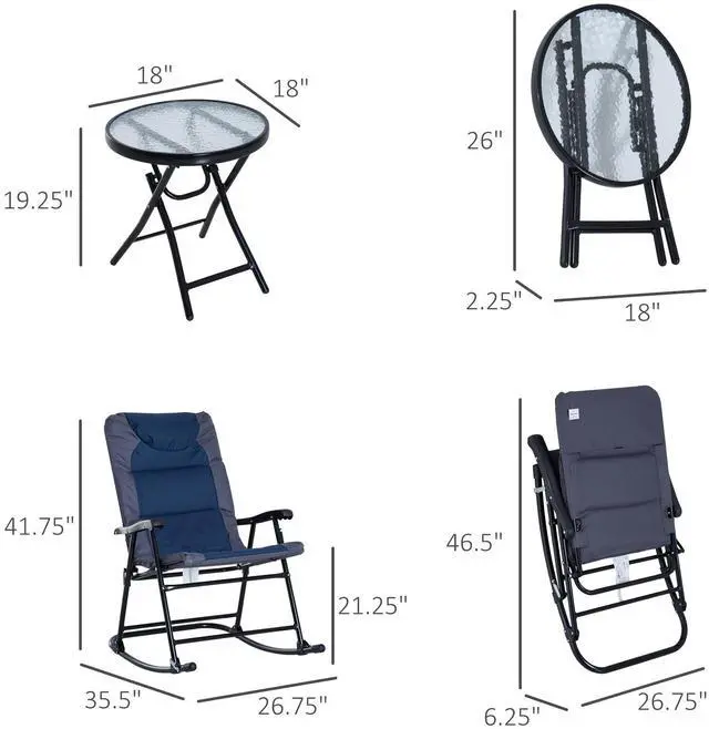 Three-Piece Patio Set: Including two rocking chairs and a round tempered glass top table, this set is a great addition to Porch, balconies, poolside, and other indoor or outdoor areas. Offering ample space to sit, take advantage of their outside safe seating by bringing them to your favorite camping space.