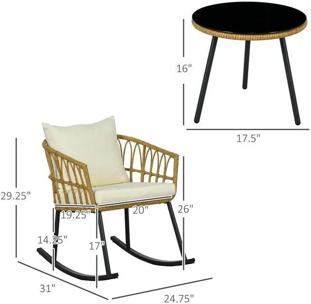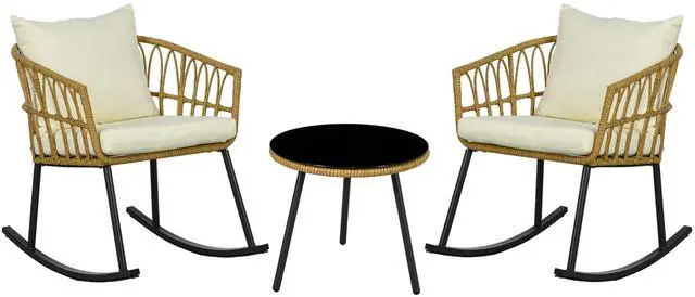 Patio Table: Our patio rocking chairs are paired with an outdoor table to make a complete wicker bistro set. Share a morning coffee or evening drink, read a nice novel, and set your phone down. 5mm thick tempered glass gives it a wipe-clean surface.