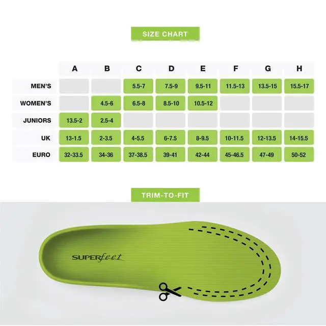 • Trim to Fit: Superfeet insoles are made to be trimmed to fit your shoes and boots; follow cutting instructions before use, and if you're between sizes, size up and trim down to fit
