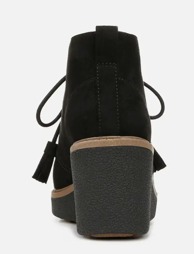 Women's wedge booties with a wow-now design. SUSTAINABLY CRAFTED: Linings and topcloth partially made from recycled plastic bottles; partially recycled toe box and heel counter. MATERIALS: Microfiber upper partially made from recycled plastic bottles or partially recycled polyester/wool blend upper. FIT: Lace up closure for a secure fit. SUSTAINABLE COMFORT: Cushioning, comfort, & support that uses 15% cushy plant-based BLOOM® foam insole. STYLE: Wedge lace up bootie with playful tassel details and 3 inch gum sole wedge heel and 1 inch platform. CONSCIOUSLY PACKAGED: This style is shipped in an environmentally preferred 1-piece box made with primarily recycled materials that can be recycled & soy-based inks. Wear-everywhere ankle boots with a trending gum sole packed with comfort and cuteness.