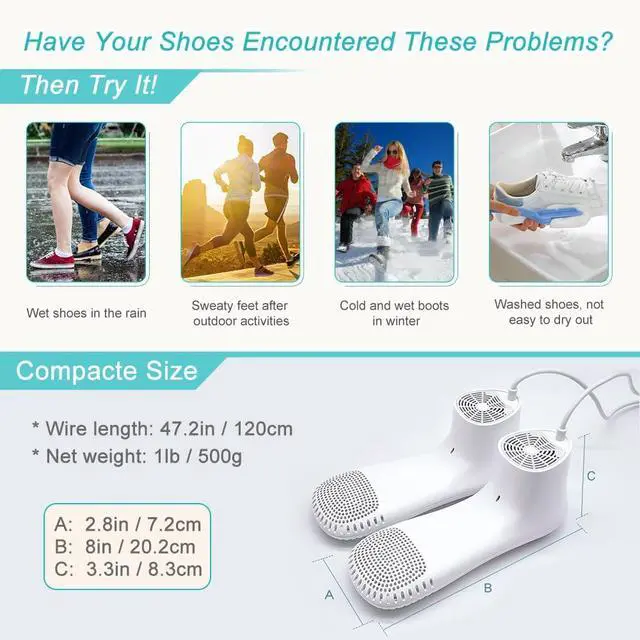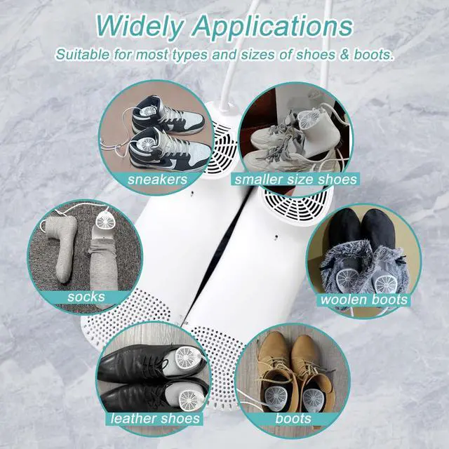 - If you want to dry a pair of washed shoes, we recommend you use the 12-hour timer mode directly, dry it overnight and wear it the next day. If the humidity of the shoes is very strong or the material of the shoes is not ventilated, this may take longer. Our shoe dryer will not make shoes or socks deforming, degumming, cracking.