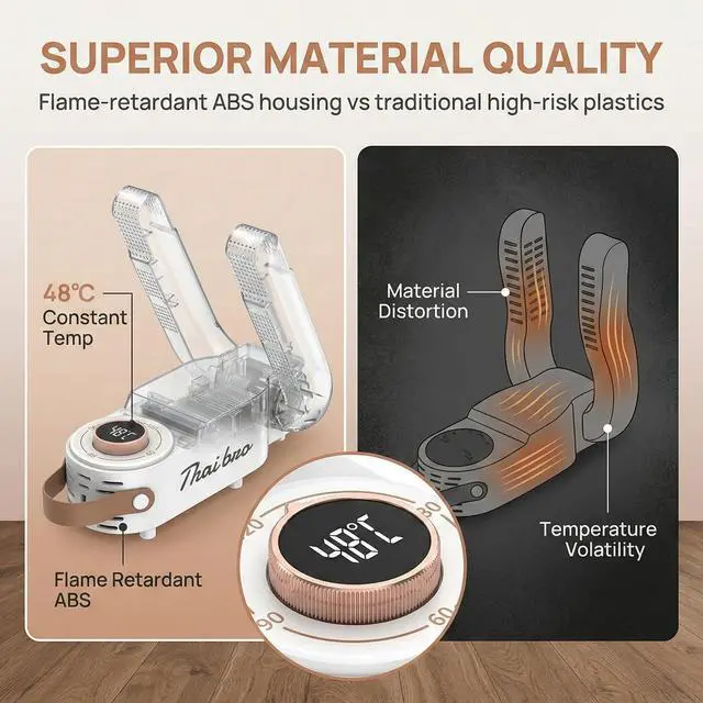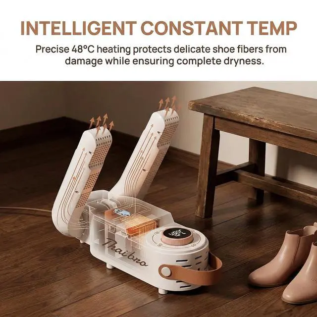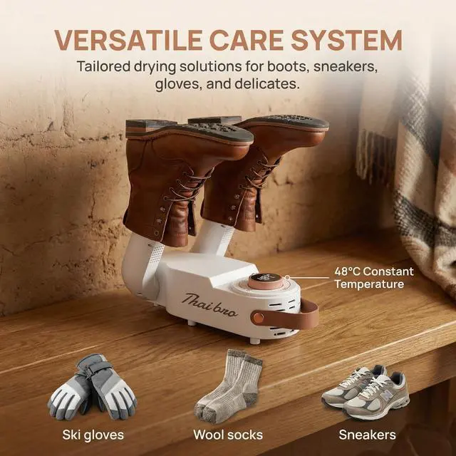 Gentle Yet Powerful: The shoe dryers for sneakers use optimal 48°C warmth to protect leather and fabrics while thoroughly drying interiors - no shrinking or damage like high-heat models.