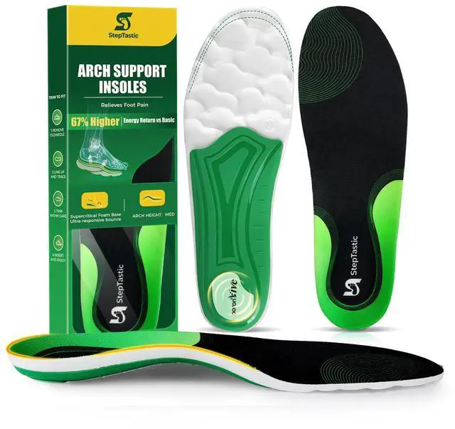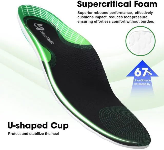 Golden Triangle Ergonomic Design: StepTastic insoles feature a three-point support structure (forefoot, arch, heel), combined with a U-shaped heel cup design that snugly conforms to your feet. They effectively relieve foot pain while providing stable support, making sure you are supported for your daily activities
