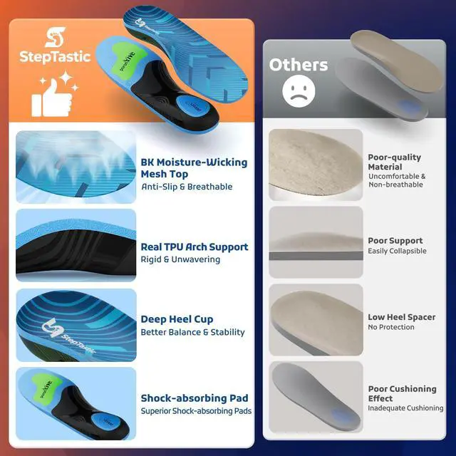 5-layer Construction & High Arch Support: Premium shock-absorbing pads in the forefoot and heel, combined with a cushioned outsole, efficiently absorb impact during walking and standing. This reduces foot fatigue while protecting your knees and joints, and the multi-layer composite structure achieves a balance of "hard support + soft cushioning" note that the arch support is intentionally rigid to provide strong support for high arches, avoiding discomfort caused by insufficient support