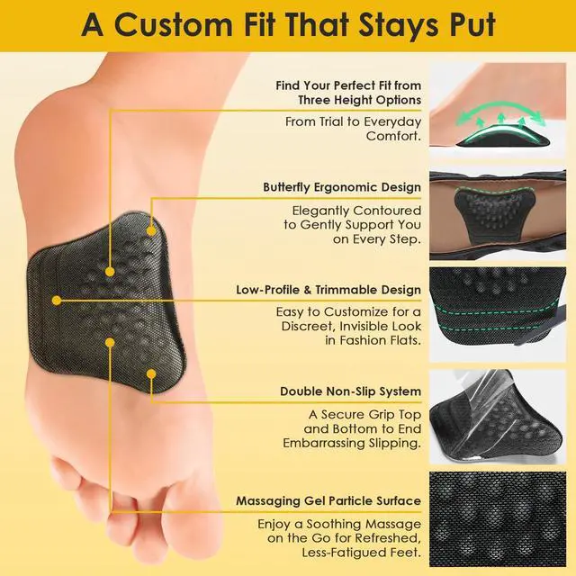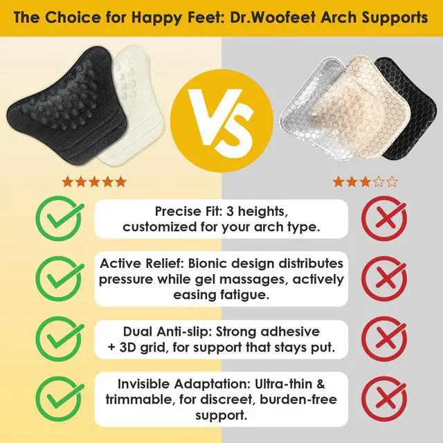 Dr. Woofeet Butterfly Arch Support Pads Your Personalized Comfort Solution Stop settling for generic shoe inserts. Dr. Woofeet brings professional-grade orthopedic support to your favorite fashion footwear. Designed with a unique butterfly contour and breathable 3D grid, our pads provide targeted relief for Plantar Fasciitis and flat feet without sacrificing style. Why Dr. Woofeet Stands Out: 3 Scientific Heights (Low, Medium, High): We understand that every foot is unique. Our product line offers three distinct height levels to ensure you get the exact support your arch requires. Please select the height that best fits your needs! 2-Color Value Combo: Each pack includes 1 Pair of Black and 1 Pair of Beige pads. This versatile combination ensures you have the perfect shade to blend into any shoe interiorfrom dark work boots to light-colored sandals. Advanced Anti-Slip 3D Grid: Forget sweaty, sliding silicone. Our breathable 3D raised texture promotes airflow and creates micro-friction, keeping your feet secure even when things get active. Fully Customizable Fit: Featuring two easy-to-follow trimmable lines, you can effortlessly adjust the length to fit narrow heels, strappy sandals, or sleek office flats. Washable & Reusable Adhesive: Built for longevity. If the pads lose their grip due to dust, a simple rinse with warm water and air-drying restores the stickiness to brand-new levels.