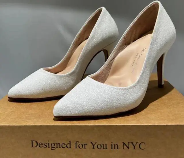 The Victoria Heel 3.0 in White Glitter from Victoria Saint NY, (likely Antonia Saint NY, a brand known for custom-fit heels), are a stylish, classic stiletto featuring a microfiber exterior, supportive cushioned insoles, and a durable ballistic nylon heel, designed for comfort with features like shock absorption and grip, making them a well-regarded choice for a dressy heel.