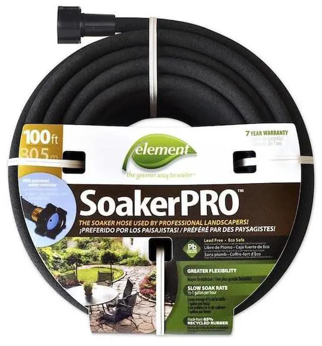 For an efficient, economical and eco-friendly way to water your plants, look no further than the Element SoakerPRO soaker hose by Swan.Featuring tiny holes or "pores" along its length, the SoakerPRO soaker hose weeps water directly to plants' root systems at a rate of 0.5 gallon-1 gallon per foot per hour on ground level. This not only reduces evaporation, but also uses up to 70 percent less water than a conventional sprinkler. To further reduce water consumption, we've added a patented blue water restrictor in the female coupling to control water pressure and flow.The SoakerPRO soaker hose is very lightweight, which makes it easy to wind around plants and set under soil or mulch. Once established, you no longer have to carry or drag a cumbersome garden hose to water your garden. In addition, your delicate flowers, foliage and vegetables are protected from the intense water pressure that comes from a traditional water hose and/or nozzle.The SoakerPRO soaker hose is made from 65 percent recycled rubber and backed by a 7-year warranty. It's also lead-free and compliant with California's strict phthalate-content standards, so no harmful chemicals or odors are added to your water supply.We've created the SoakerPRO soaker hose as a 25-foot soaker hose, a 50-foot soaker hose a 75-foot soaker hose, a 100-foot soaker hose and a 250-foot bulk soaker hose, so you'll have enough length to satisfy any watering issue, from a small flowerbed to a large stretch of landscape.
