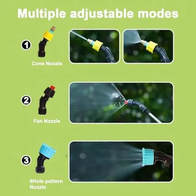 4 type nozzles not 3Our battery sprayer have 4 nozzles (not 3 type nozzles currently sold in the market), We update one new nozzle that can 360° twisting, It can move up and down, left and right, idea chooice of battery powered weed sprayer