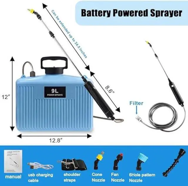 Reasonable DesignPacking include 2pcs electric sprayer, one is 2.4 gallon battery operated sprayer for garden use and 0.5 gallon automatic sprayer indoor use.