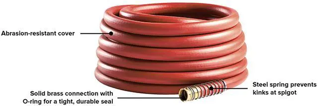 The Gilmour Pro commercial 3/4" x 75' heavy duty water hose is made of double-reinforced, commercial grade rubber and vinyl with a rugged, abrasion-resistant red cover that wont mar surfaces. 75' long garden hose is built to tackle tough tasks and terrain and will hold up to the roughest jobs and weather conditions. Its heavy-duty brass couplings with O-rings provide a tight, durable seal every time, and a long-lasting protective steel spring coil prevents kinks at the spigot. This outdoor hose has undergone rigorous testing to ensure its able to tolerate water pressure fluctuations, rough and rocky terrain exposure to the elements. Any professional gardener will tell you, the right tools can make a world of difference when maintaining your lawn or garden. Trust Gilmour to provide reliable, comfortable watering solutions to turn any day into a betterday.