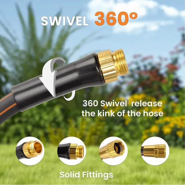Experience the perfect blend of durability and convenience with our premium Garden Hose. Measuring 100 feet in length and 5/8" in diameter, this heavy-duty hose is constructed with a robust 3mm thick, 3-layer design featuring a lightweight hybrid core and a bursting-resistant polyester mesh. It's designed to withstand extreme temperatures, from 40F to 150F, ensuring all-season use. The innovative memoryless material prevents kinking, while the swivel handle allows for easy, twist-free handling. Equipped with all-aluminum plated connectors, it ensures a leak-proof seal and effortless connection to faucets, nozzles, or sprinklers. With a maximum working pressure of 150 PSI, it's perfect for residential use. Coil and uncoil with ease, thanks to its lightweight design. Backed by a 24-month warranty, you can enjoy peace of mind with our professional customer support.