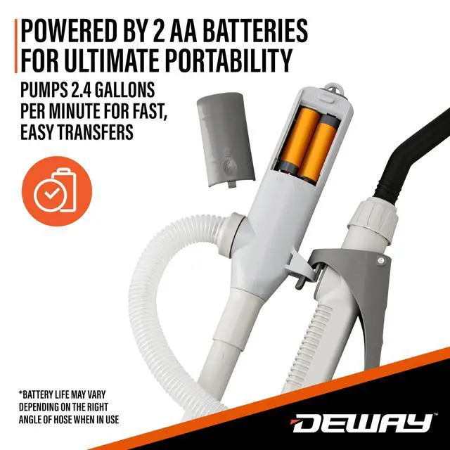 No more fumbling with heavy gas cans! Let the pump do the heavy lifting with the DeWay Battery-Powered Stick Transfer Pump collection. Featuring four newly redesigned pumps for transferring gasoline, kerosene, diesel fuel, non-corrosive liquids, non-potable water, dirty aquarium water, and more, this powerfully portable lineup offers options for convenient one-hand and completely hands-free operation. So whether youre looking for a simple manual siphon for fueling cars and lawn equipment or a set and forget pump with automatic overflow detection, theres a model built to meet your specific needs. Instead of using a bulky control panel or external machine to pump, our highly-efficient motor is housed inside a thin, narrow suction stickmeaning, the intake tube fits inside almost any gas can or similar receptacle! Each pump comes equipped with an extended 39 discharge hose (clear, black, or rubber depending on your model), easy-access battery box with protective cover, drip-free hose storage clip, and simple on/off power switch. The collection also features four unique nozzle options to accommodate a wide range of uses, but all boasting the same impressive 2.4 gallon-per-minute transfer rate for the fastest, most efficient siphoning action run on batteries. So, stop putting your back and body in dangerous positionsand stick to the portable pump experts! Add a DeWay Battery-Powered Stick Transfer Pump to your cart today!