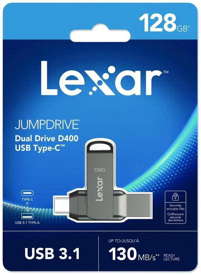 Offers a 128GB storage capacity. Dual connectors with USB Type-C and USB Type-A ports.