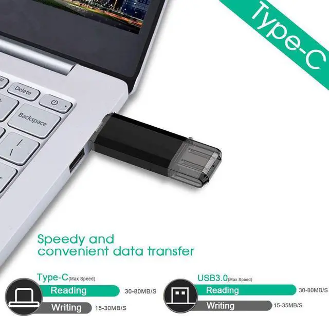 Product: The USB C thumb drive comes with a USB Type C connector and a USB 3.0 connector. It lets you quickly transfer data, files, photos, videos between smartphones, tablets, laptops, and computers.