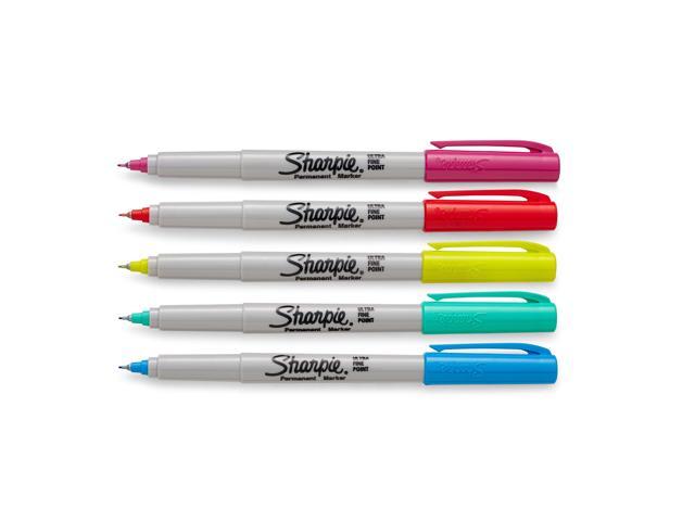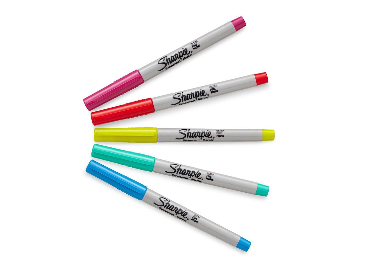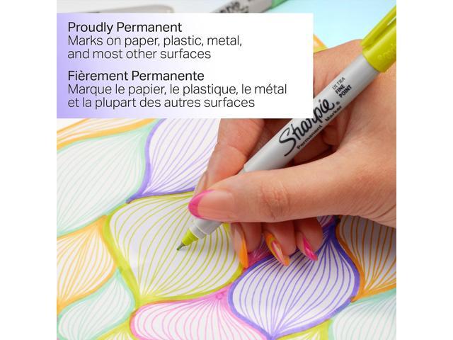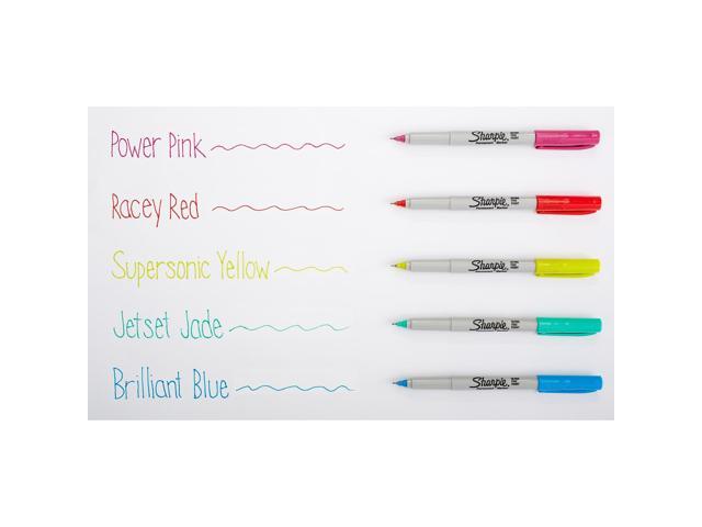 - Proudly permanent ink marks on paper, plastic, metal and most other surfaces. Colorful Options: Includes Power Pink, Racy Red, Supersonic Yellow, Jetset Jade, Brilliant Blue and 19 classic Sharpie permanent markers.
