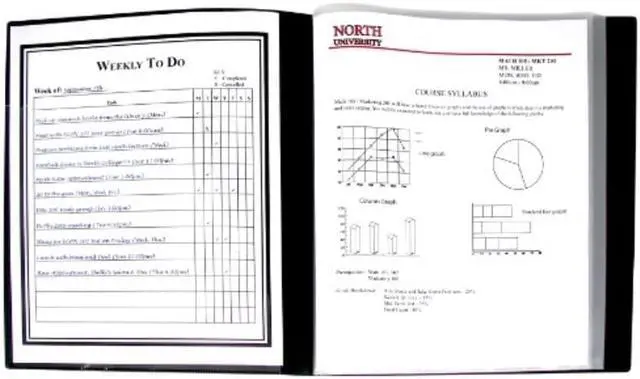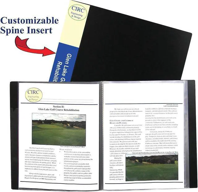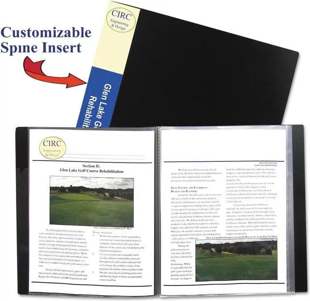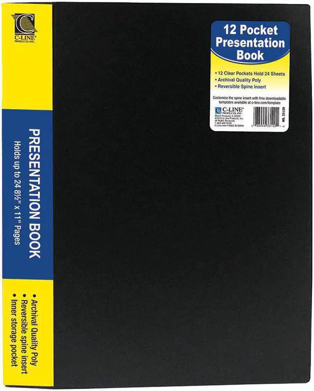 Presentation book features 12 bound-in, clear, top-loading, polypropylene sheet protectors that lie flat while the book is open. Ideal for reports, projects, artwork display and more. Storage pocket on the inside front cover holds extra materials. Clear view, spine insert is reversible for instant customization. Poly material is acid-free for archival quality. Presentation book holds up to 24 letter-size pages.
