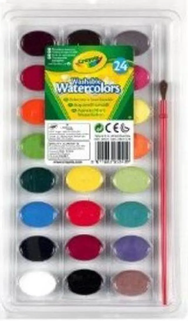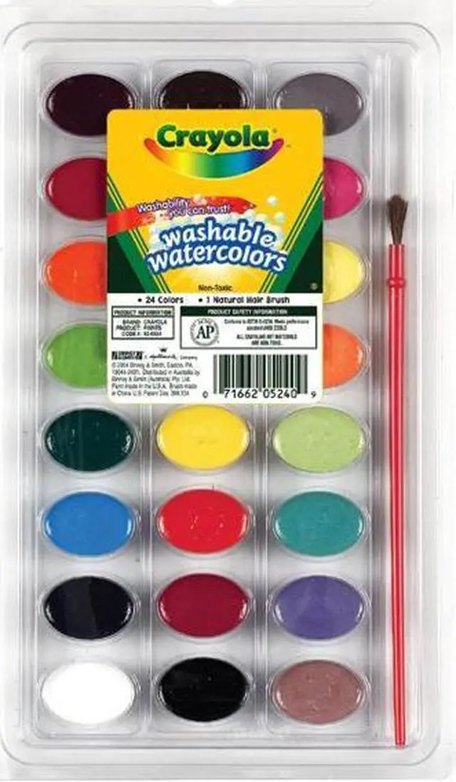 CRAYOLA-Washability you can trust! Package contains 24 washable watercolors and 1 natural hair red paintbrush. Non-toxic. Conforms to ASTM D4236. Meets performance standard ANSI Z356.5. Paint made in the USA. Brush made in China.