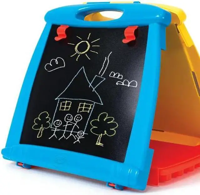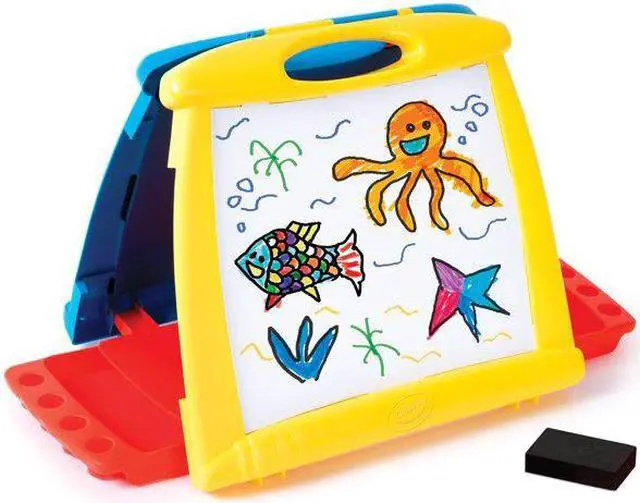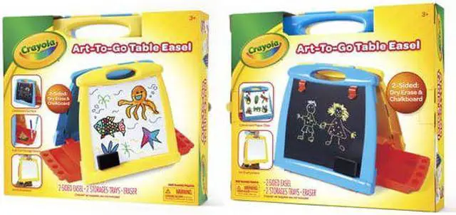 Inspire budding young minds to explore their creativity anywhere they go with this portable table-top Crayola kids easel. This kid's arts easel features dry-erase board on one side and a traditional chalkboard on the opposite side. The drawing area on this toddler easel provides ample space for little artists to enjoy painting, drawing, and writing. Two storage trays are built in to the easel and can hold small accessories and art supplies. Standing 12.3 inches high, this art easel for kids is great for tabletop use and also folds down to 2 inches for easy storage in and around the play area.