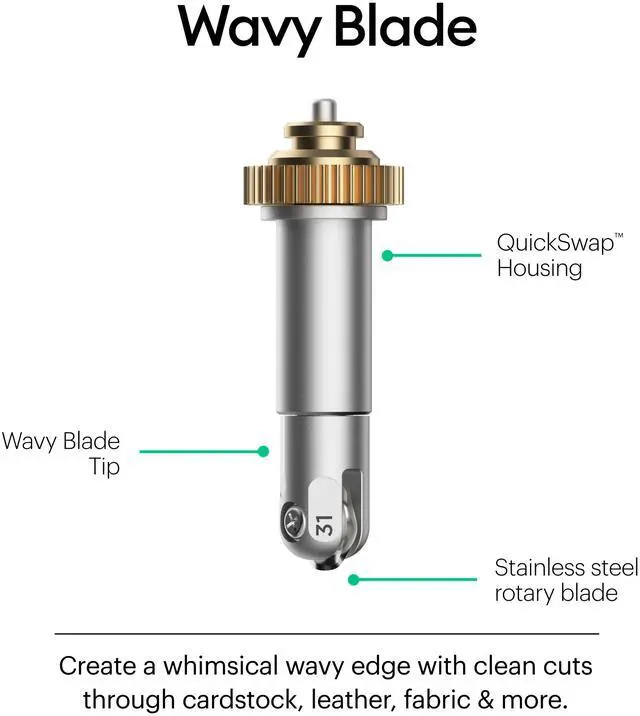 Get a decorative edge in half the time than a drag blade with a gentle wave cut for a wide variety of projects. To add a whimsical wavy edge to any design, just snap this tip onto the QuickSwap Housing and tell your Cricut Maker to "Go! " This specially sculpted stainless steel blade is great for original vinyl decals, iron-on designs, envelopes, cards, gift tags, and collage projects, or any time you need fabulously finished edges and stylish design accents. Perfect for iron-on, vinyl, paper, cardstock, fabric, and more. For use with Cricut Maker machines.