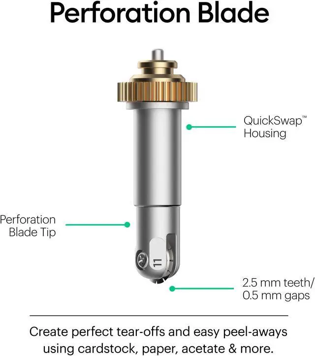Get the perfect tear quickly and effortlessly with precise perforation cuts for a wide variety of projects. To create uniform, finely perforated lines for any design, just snap this tip onto the QuickSwap Housing and tell your Cricut Maker to "Go! " Evenly spaced perforation lines allow for clean, even tearing without the need to fold beforehand - especially great for shapes with curves. Perfect for tear-out booklet pages, raffle tickets, homemade journals, or for any project that demands a clean tear. For use with Cricut Maker machines.