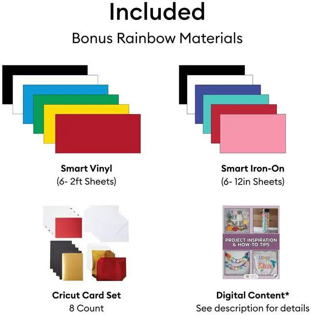 The Essential Bundle includes must-have tools and materials like Smart Vinyl, Smart Iron-On, Value Cardstock, Insert Card Sets, and Printable Vinyl. It's enough supplies to create up to 100 projects.This bundle includes Smart Vinyl and Smart Iron-On samplers for mat-free cutting, Cricut Pens for drawing and writing, and a Cricut card set for beautiful handmade cards. To guide your creativity, you'll also receive a digital design eBook with access to over 100 projects in Cricut Design Space, giving you step-by-step inspiration from day one.