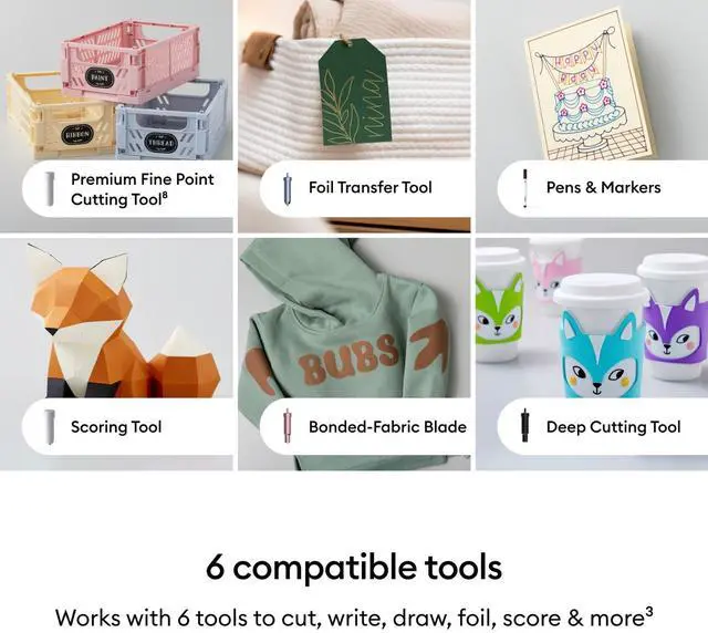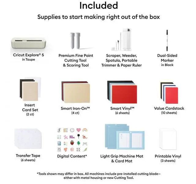 Cricut Explore 5 is the newest generation of our Cricut Explore machines - perfect for making a variety of projects like custom decals, personalized apparel, full-color stickers, cards, and so much more. You can even make in multiples! 30% more compact than previous models, Cricut Explore 5 features an aesthetic new look and simplified interface for a more intuitive experience - all with the same dependable 12 in (30.5 cm) cutting performance. Available in a brand-new Taupe color. Start creating instantly with the Cricut Explore 5 Essentials Machine Bundle, a thoughtfully curated set designed for beginners and experienced makers alike. The Cricut Explore 5 precisely cuts over 100 materials, making it easy to create vinyl decals, iron-on designs, greeting cards, labels, and more.