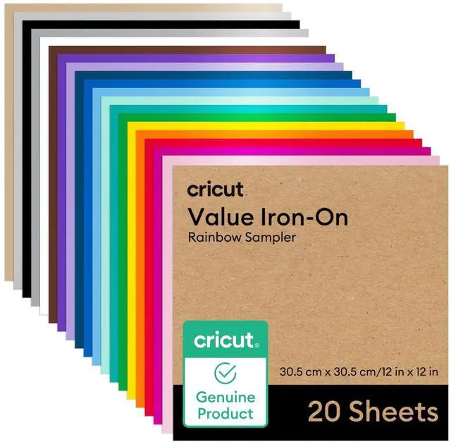 Just add heat! With Cricut Value Iron-On, you can personalize T-shirts, jackets, backpacks, and so much more. The sampler includes 20 sheets with a range of colors to help bring your most vibrant ideas to life. It also has a clear, heat-resistant backer for easy pressing, and outlasts 25 washes. Cricut Value Iron-On is engineered to give you the perfect blend of cost and quality. By selling in bulk sizes and with simple packaging, we pass the savings on to you. Optimized for Cricut cutting machines.