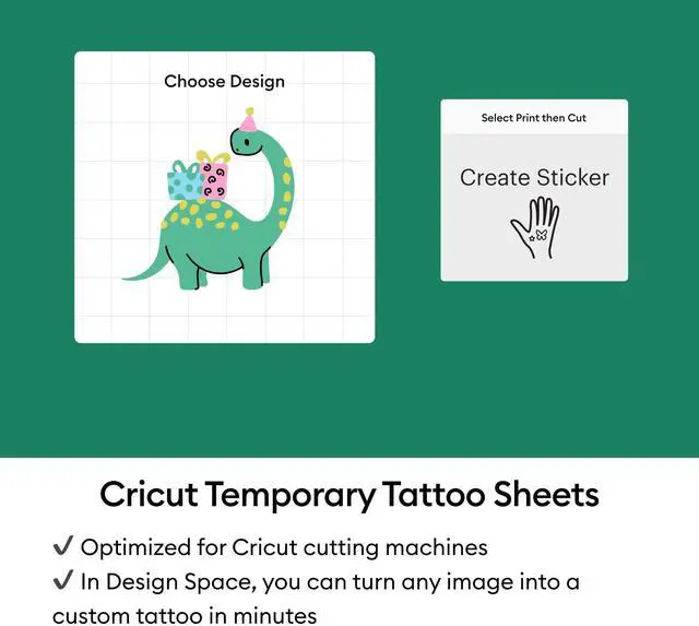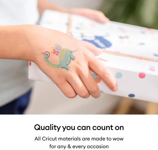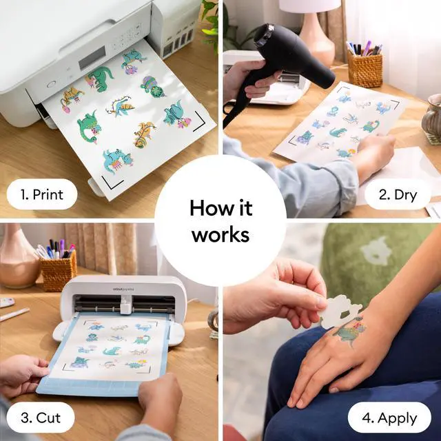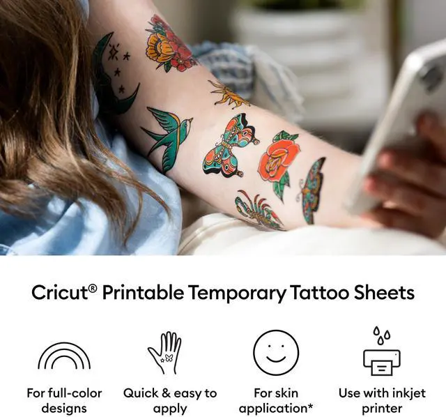 Create personalized temporary tattoos quickly and easily with Cricut Printable Temporary Tattoo Sheets. This pack includes eight sheets, each measuring 8.5 inches by 11 inches, designed for use with your home inkjet printer to produce vibrant, full-color designs. Ideal for party favors or team events, simply print your chosen design, carefully dry it with a blow dryer, and then apply it to skin using water for temporary wear. These sheets are optimized for Cricut cutting machines, offering automatic cut settings in Design Space for a smooth crafting experience, ensuring your tattoos stay put but can be removed with ease.