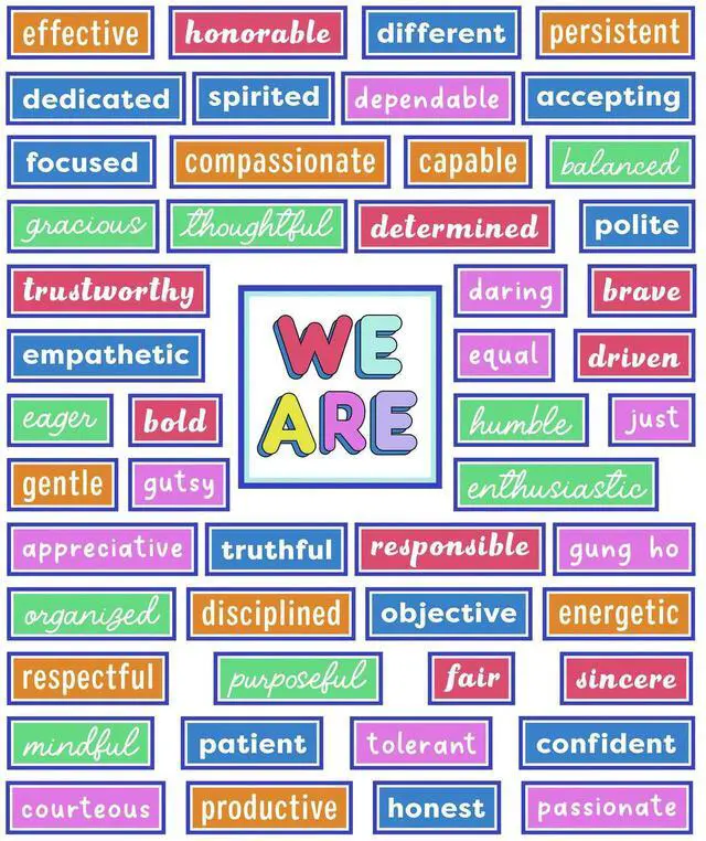 • Package Includes: (1) "We Are" Header, Assembled from (2) Pieces: 10.5" x 10.5"; (50) Word Cards: Largest: 11.5" x 2.8", Smallest: 4.5" x 2.8"